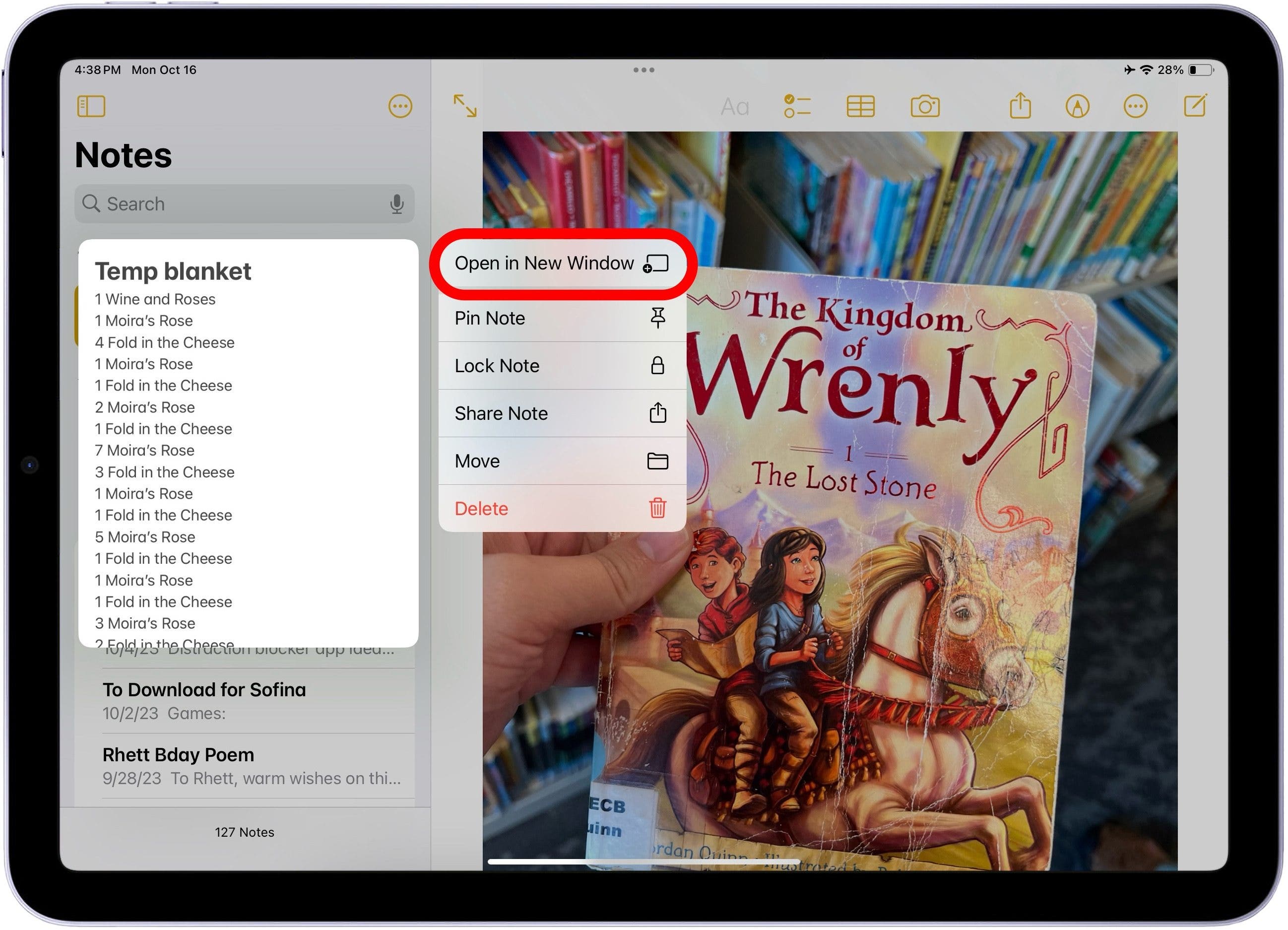 - 在受支持的應用程序(例如“備忘錄”)中,長按要居中的項目,然後點按在新窗口中打開。