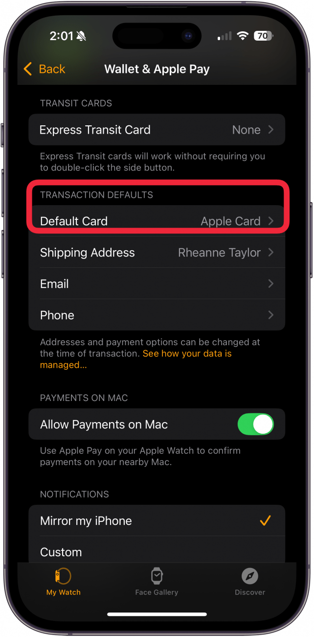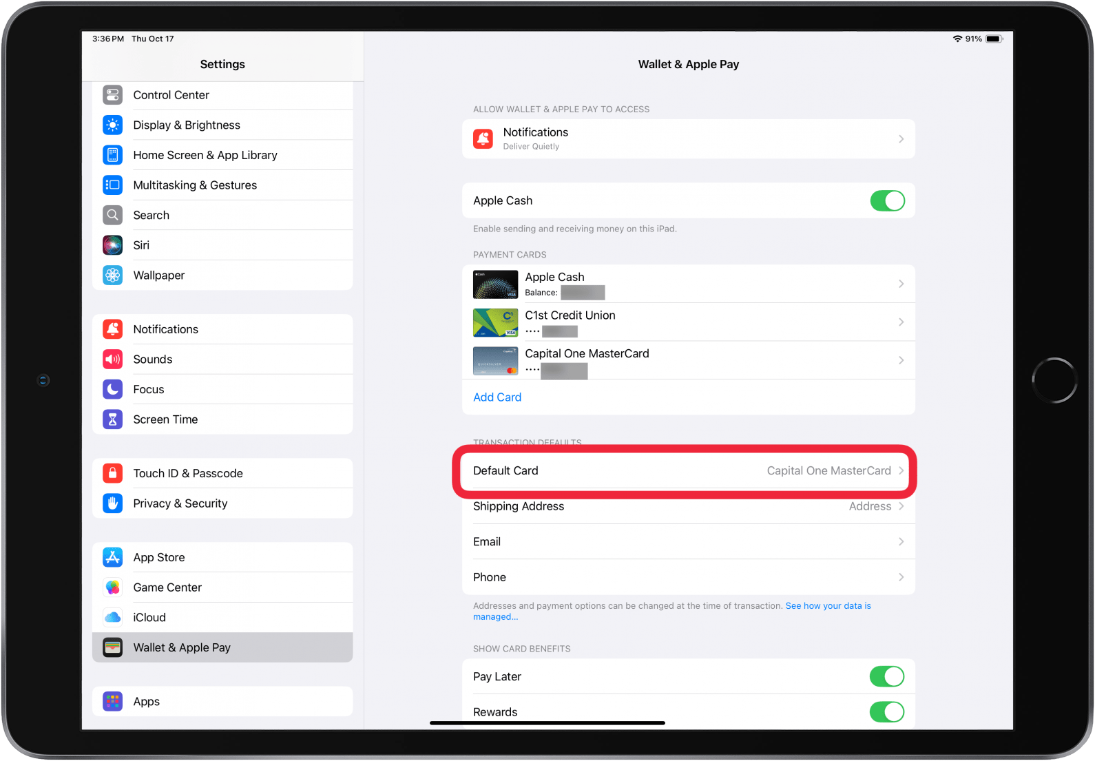 - 如果您在 Apple Pay 中為一台設備設置默認卡,它不會自動成為所有其他 Apple 設備的默認卡。