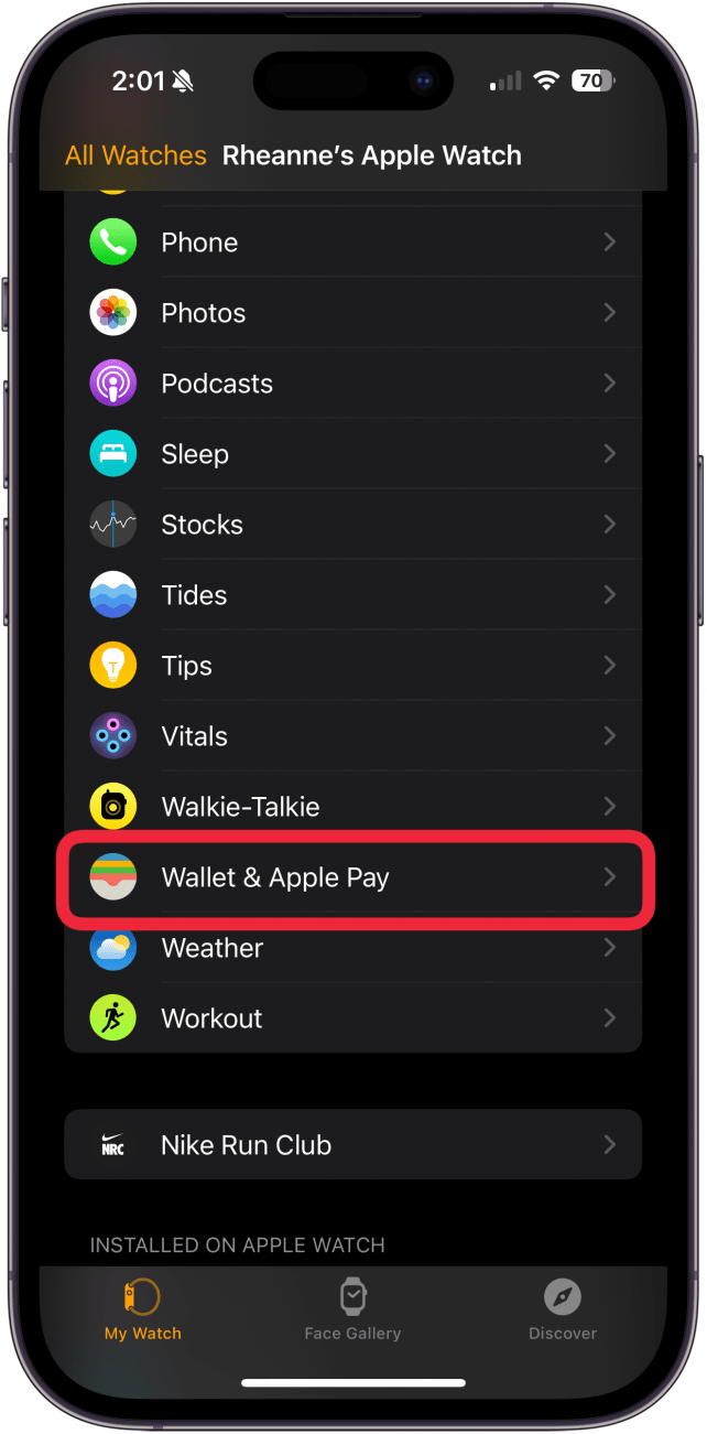 - 點擊我的手錶選項卡屏幕底部,然後點擊錢包和蘋果支付。
