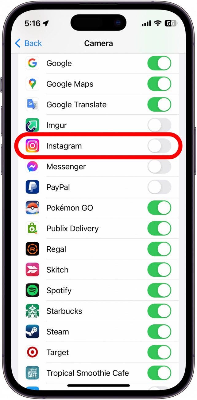 解決相機等問題的第一步是測試其他應用程序,看看問題是否存在。例如,嘗試打開 Instagram 並查看您的相機是否可以在該應用程序中使用。如果沒有,請確認您已授予應用程序訪問相機的權限: