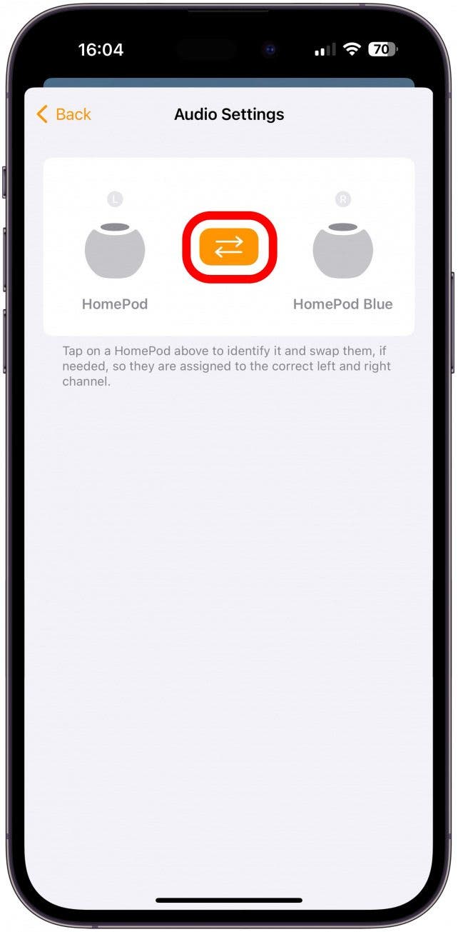 - 按照屏幕上的說明識別左右揚聲器,然後點擊中心箭頭圖標如果您需要從左到右切換 HomePod 頻道。