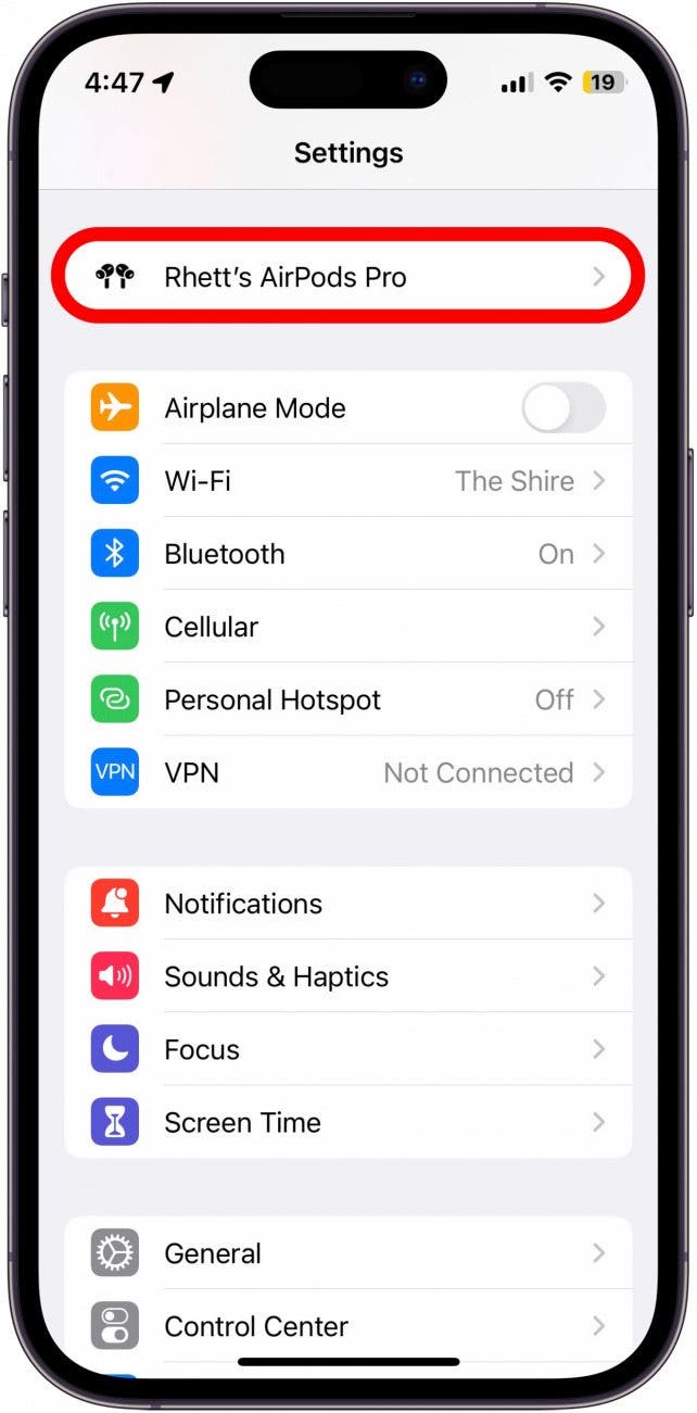 - 將 AirPods 連接到 iPhone 後,打開設定應用程式,然後輕按您的 AirPods。