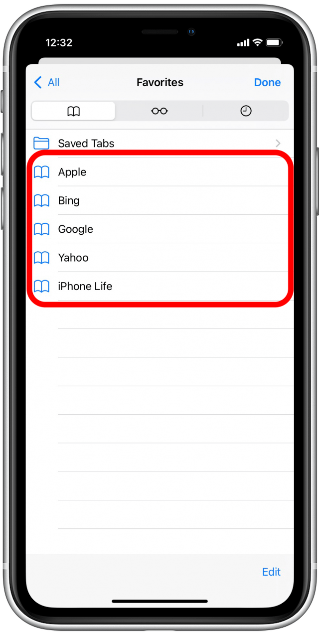 - 現在您將看到所有收藏夾的列表。從 Safari 收藏夾中點擊您想要訪問的網站或頁面。