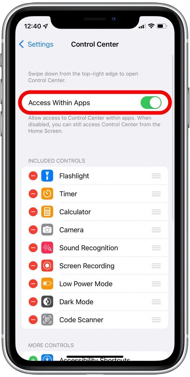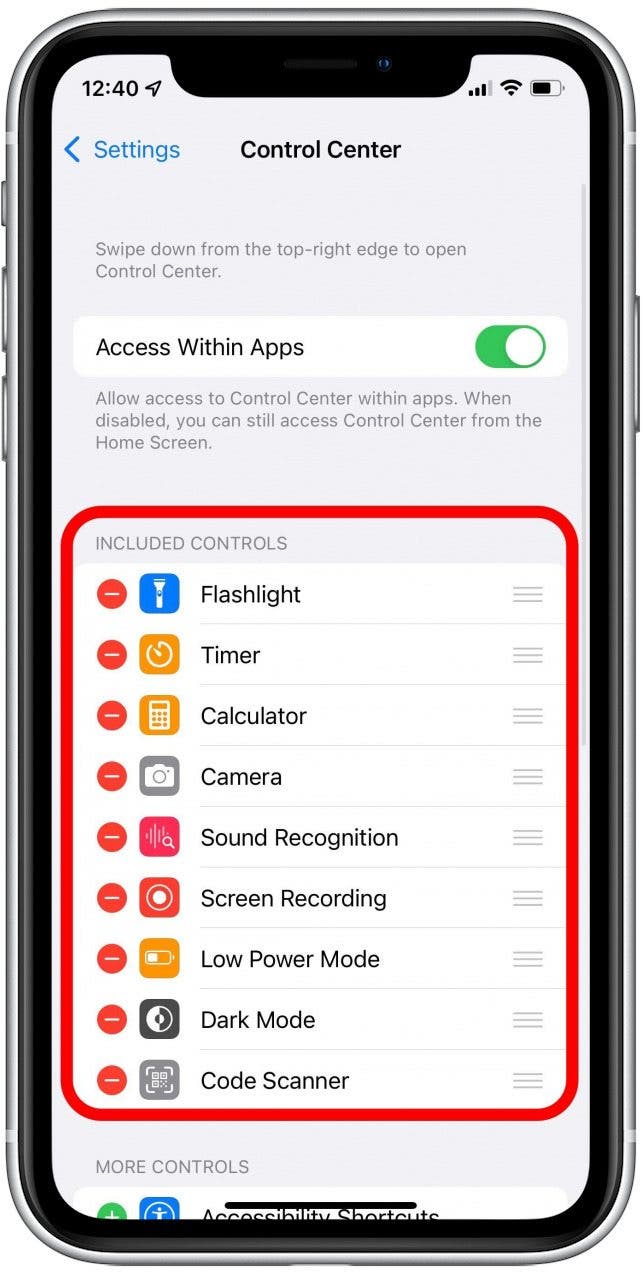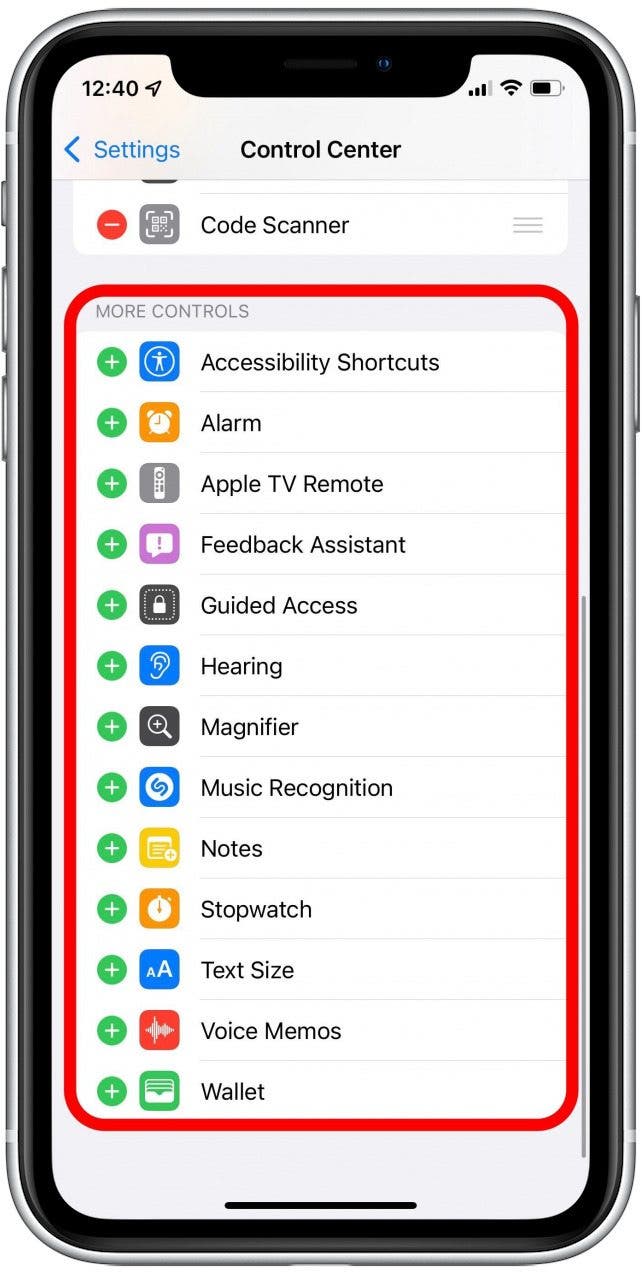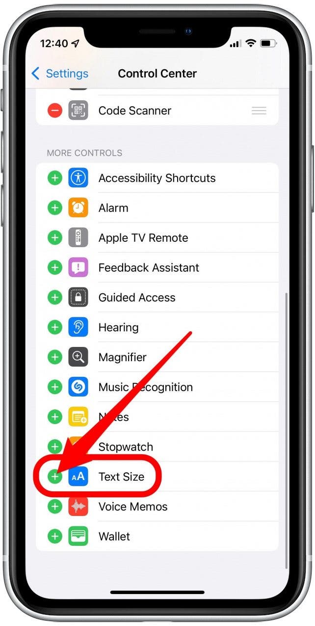 - 在包含的控件部分,您將看到控制中心內已有的項目。筆記: 如果您在此部分中看到文字大小,則表示它已位於您的控制中心中。跳至下一節。