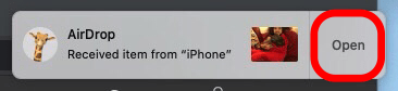 - 您會聽到一聲 ping 聲,並在 Mac 屏幕上看到一條通知;點擊打開查看您剛剛通過 AirDropped 發送的文件。