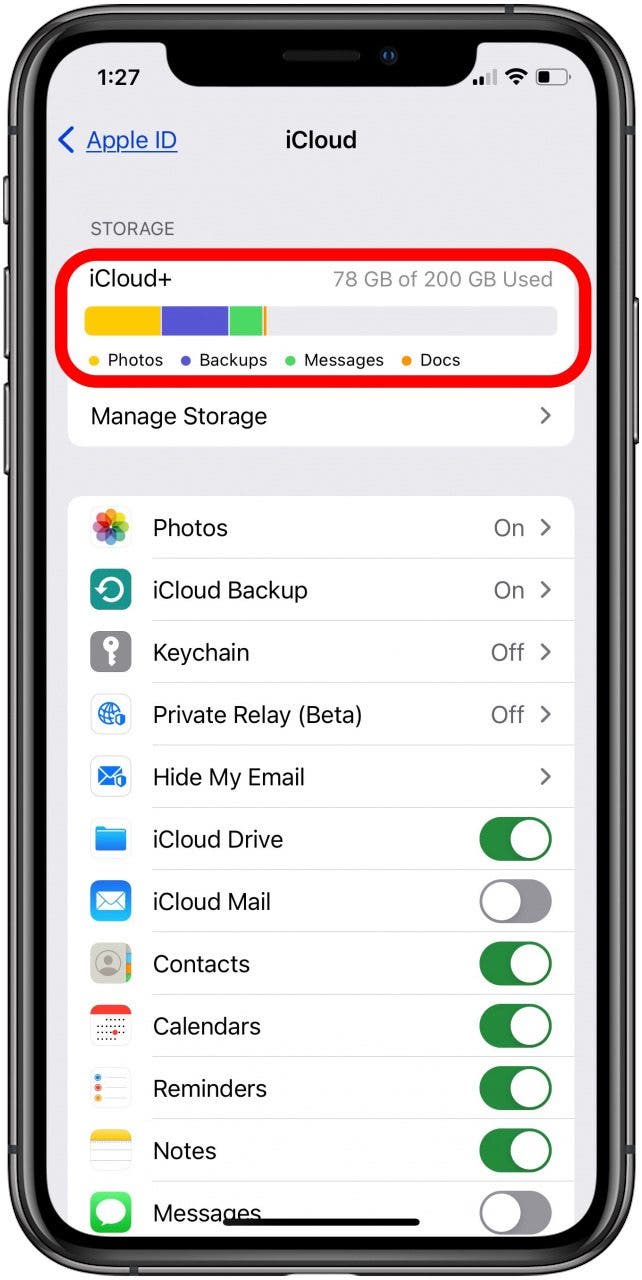 - 您將在屏幕頂部看到已使用的 iCloud 存儲空間量以及可用量。