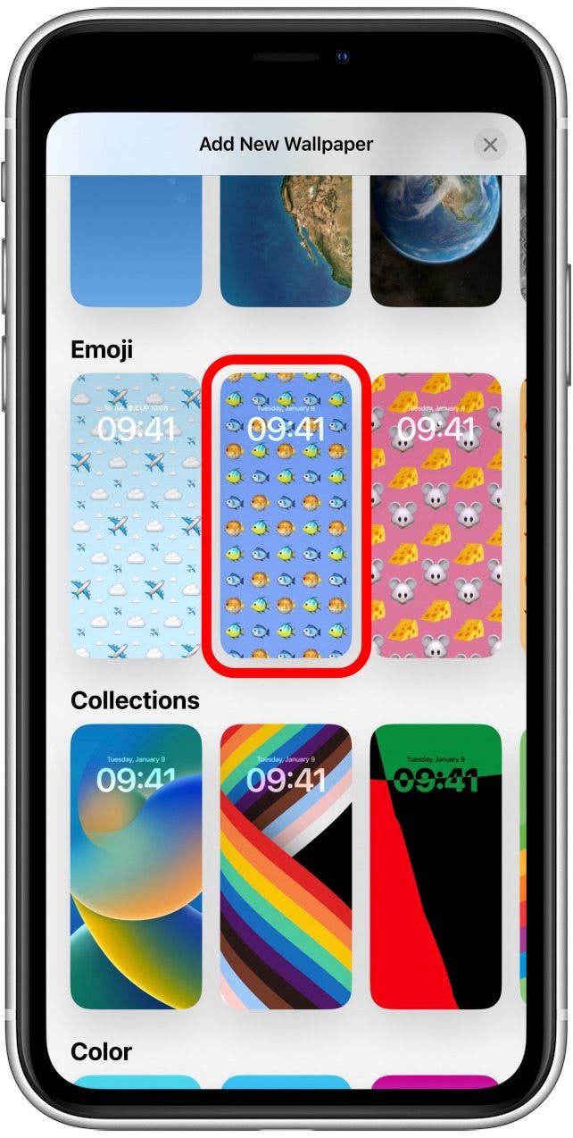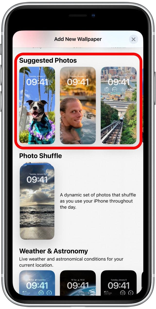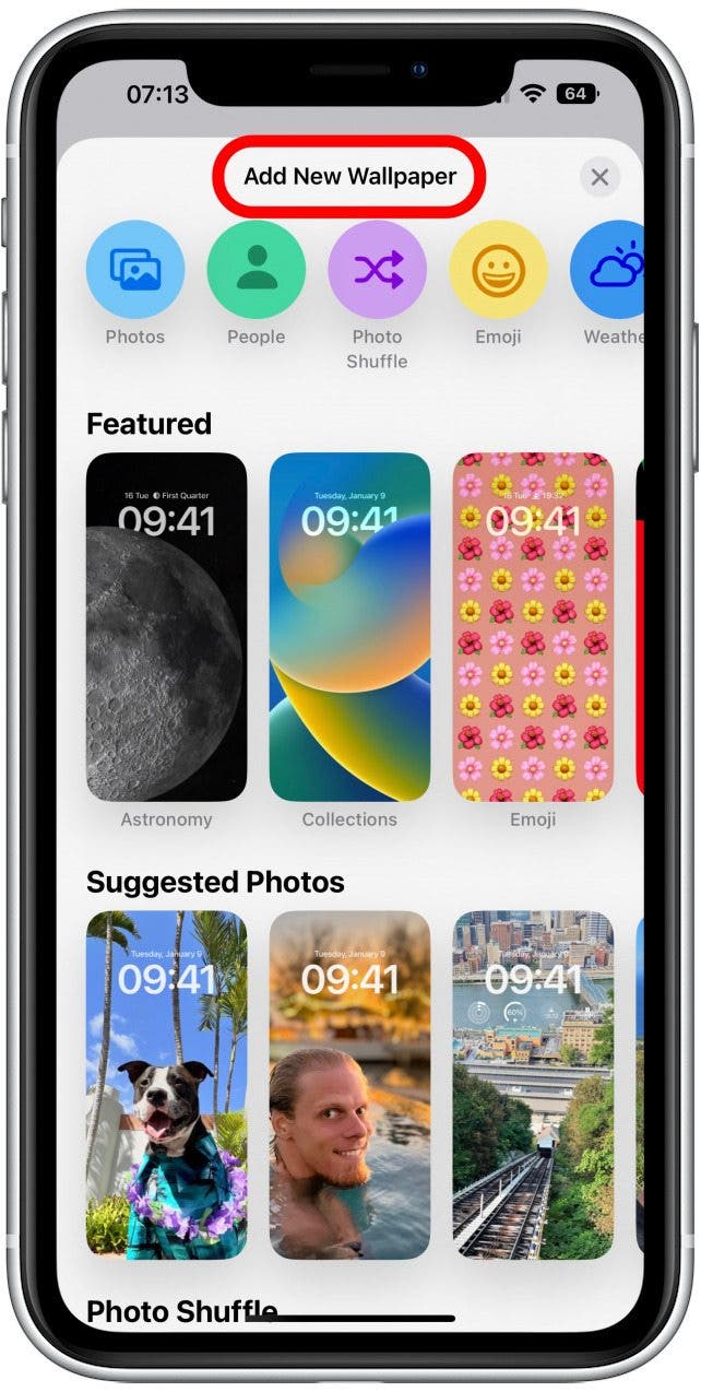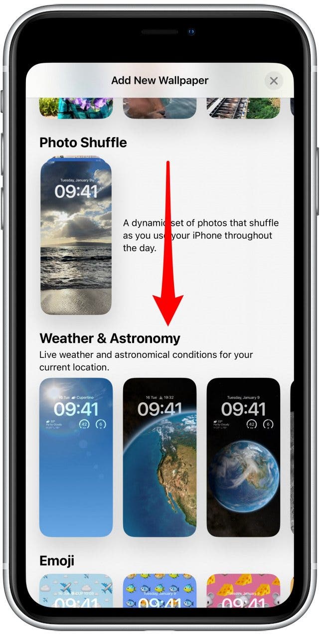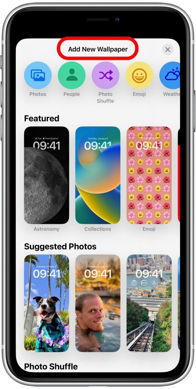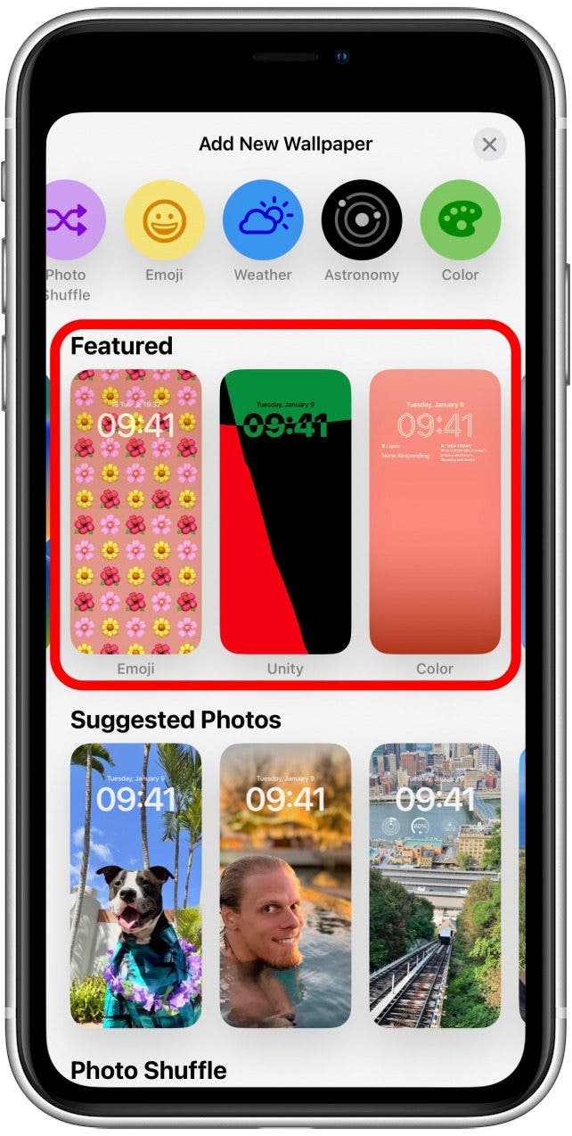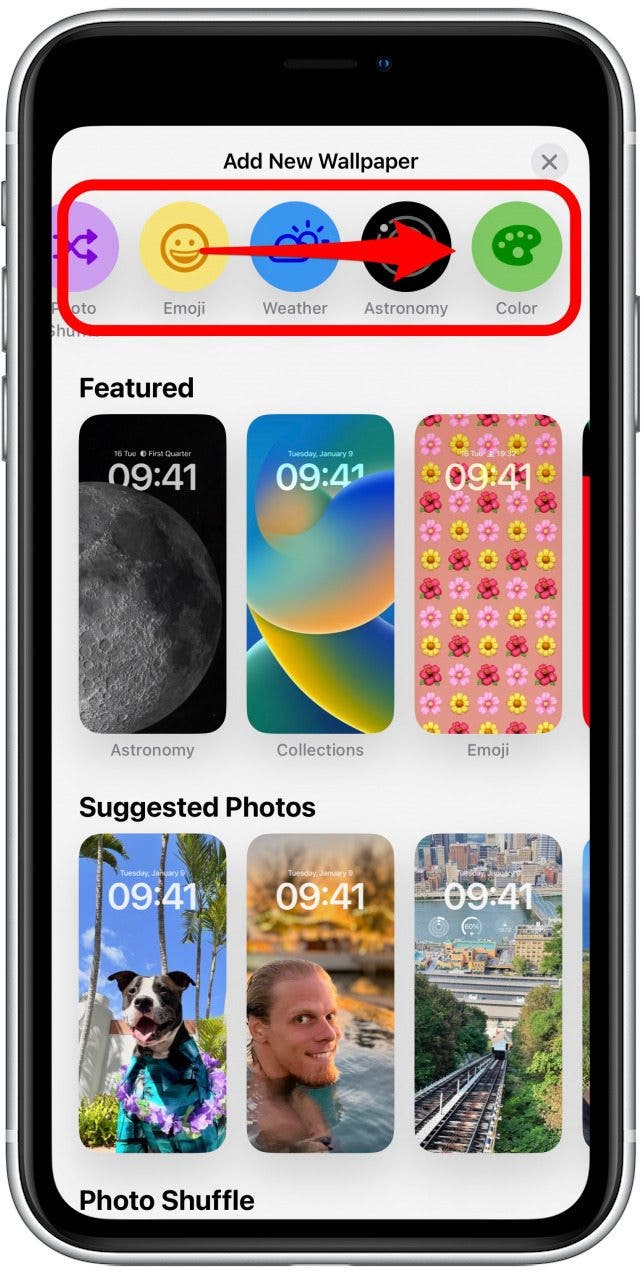 - 在最頂部,您會看到圓形圖標。您可以向左滑動查看更多選項。其中包括照片、人物、照片隨機播放、表情符號、天氣、天文學和顏色。選擇其中之一可以讓您從頭開始構建鎖定屏幕。