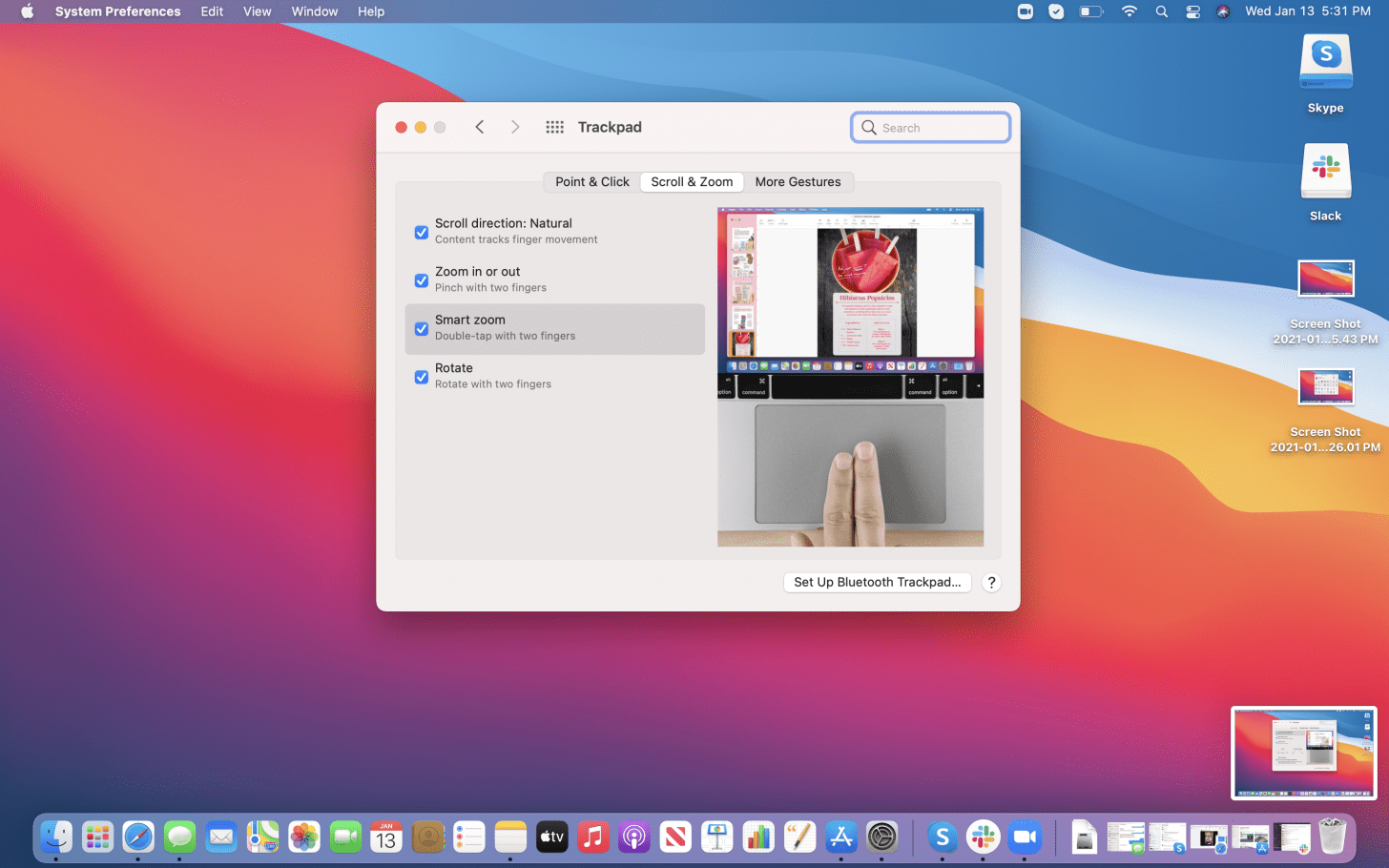 - 放大或縮小允許您通過在觸控板上進行捏合動作來進行縮放。將手指合攏會縮小,將手指拉開會放大。關閉此功能後,您將只剩下手動縮放選項,如果您發現自己不小心縮放了很多和/或根本不想縮放太多,這會很有幫助。