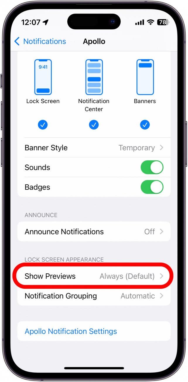 - 向下捲動並點擊顯示預覽選擇該特定應用程式是否在鎖定畫面上顯示預覽。您將擁有與步驟 3 和 4 相同的選項。