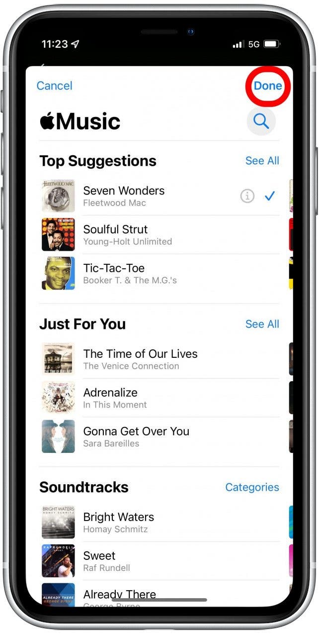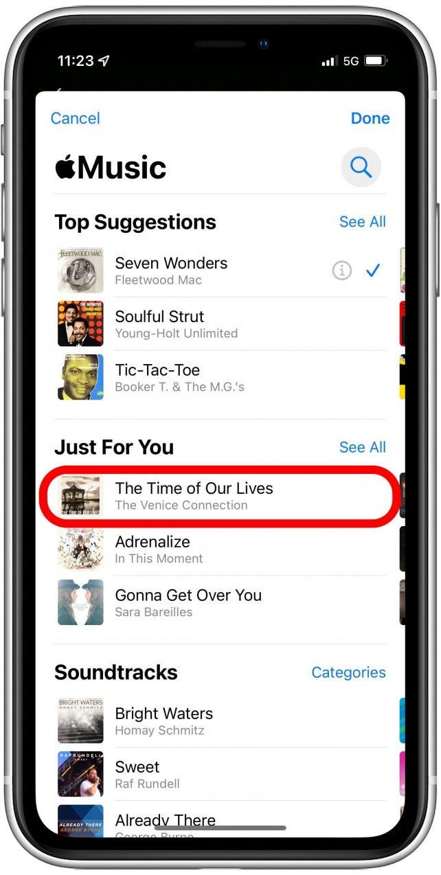 - 輕按音符圖標後,在 Apple Music 或音樂庫中找到您想要使用的歌曲,然後輕按它。