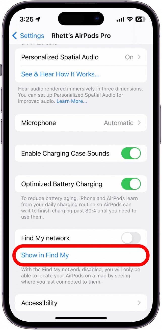- 向下滾動並點擊旁邊的切換按鈕找到我的網絡使其變成灰色。僅當您擁有第三代 AirPods、AirPods Pro(所有代)或 AirPods Max 時,此切換才會出現。如果您沒有出現此切換,請跳至步驟 5。