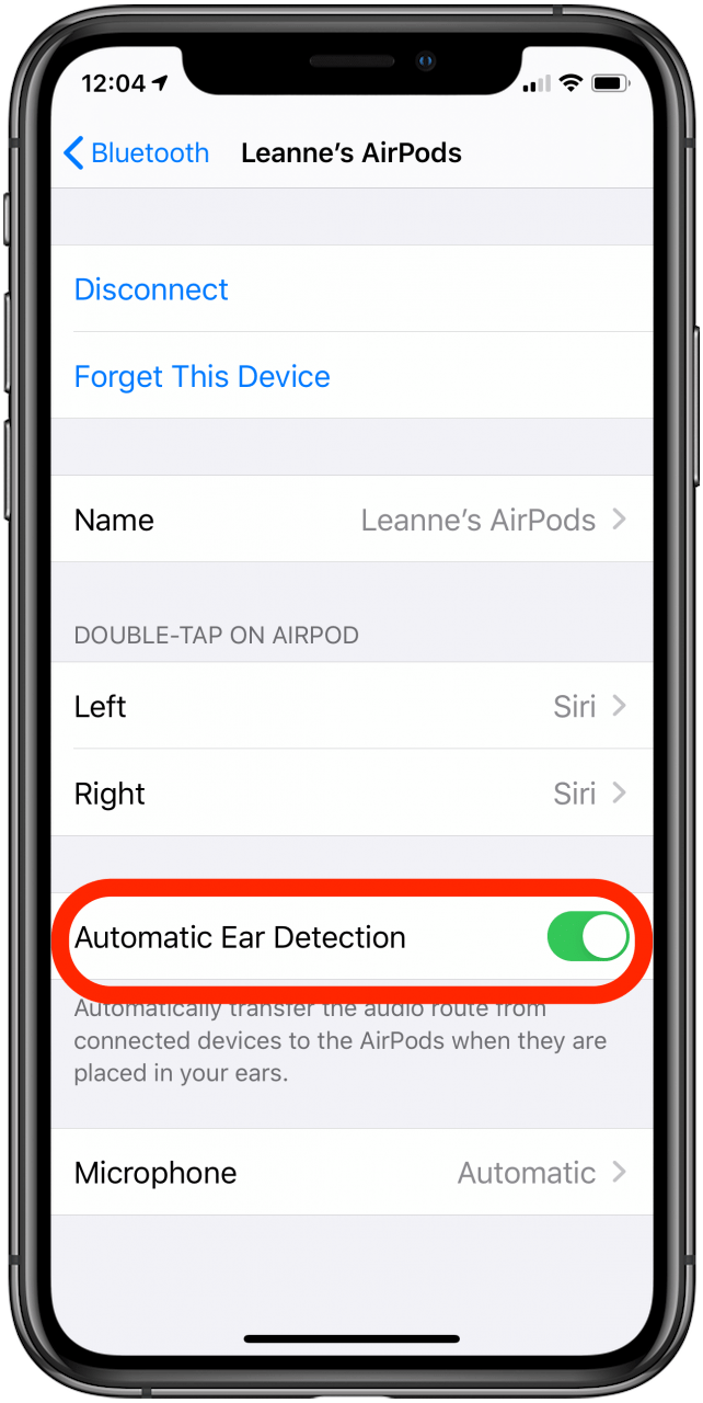 - 如果這不起作用,請轉到與上面相同的藍牙設定選單,然後關閉自動耳朵偵測。 AirPods 僅在偵測到已放入您的年份後才會開始播放音訊。如果它們無法正確識別是否在耳朵中,則可能無法打開。關閉自動耳朵偵測將意味著它們在不在保護套中時始終保持開啟。這會對電池壽命產生不利影響,因為當您將 AirPod 從耳朵中取出時,它不會進入睡眠狀態。