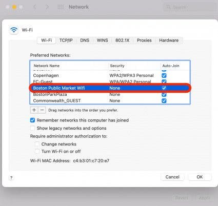 這就是全部了!最後一點提示,您的 Mac 會根據 Wi-Fi 日誌的順序確定首先連接哪個網絡的優先級。單擊並向上或向下拖動網絡以更改順序。如果範圍內有多個網絡,您的 Mac 將首先嘗試頂部的網絡。