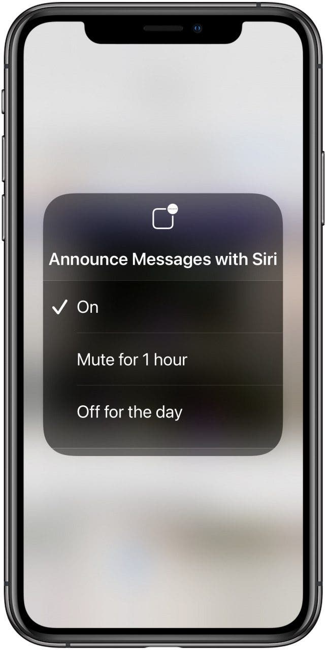 - 長按使用 Siri 圖標宣布消息顯示包含更多選項的菜單,包括在,靜音1小時, 或者當天休息。