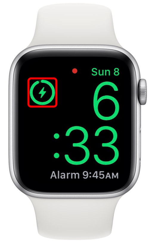 - 如果您的 Apple Watch 正在充電,您會在充電環頂部看到一個小閃電圖標。