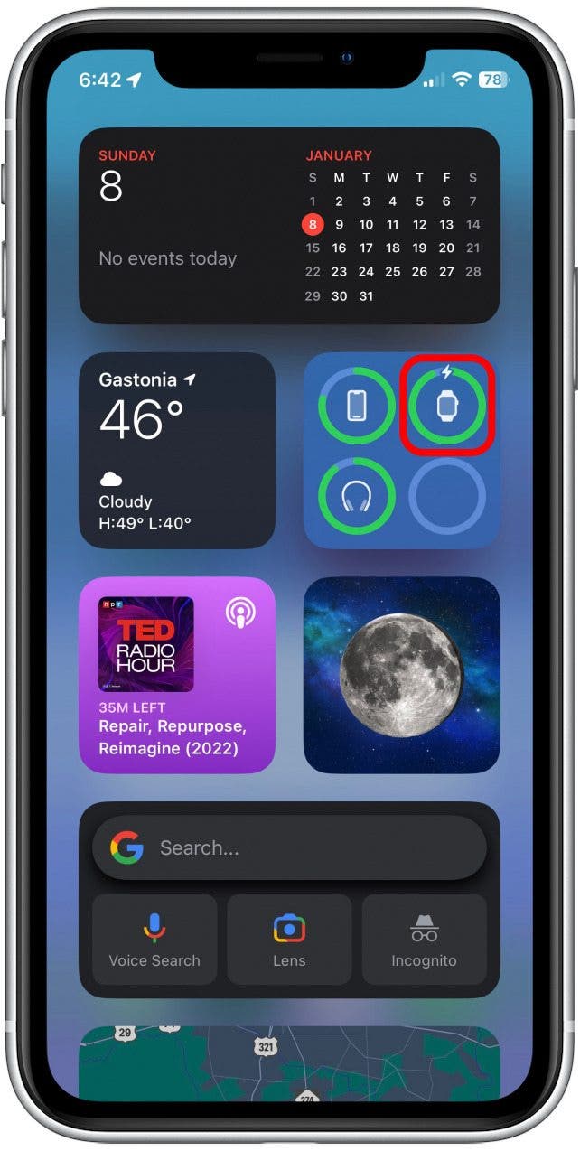 專業提示:您可以下載電池電話應用程序(免費)在您的 Apple Watch 或 iPhone 需要充電或充滿電時收到警告。您甚至可以將其添加到您的並更改電池圖標的外觀。