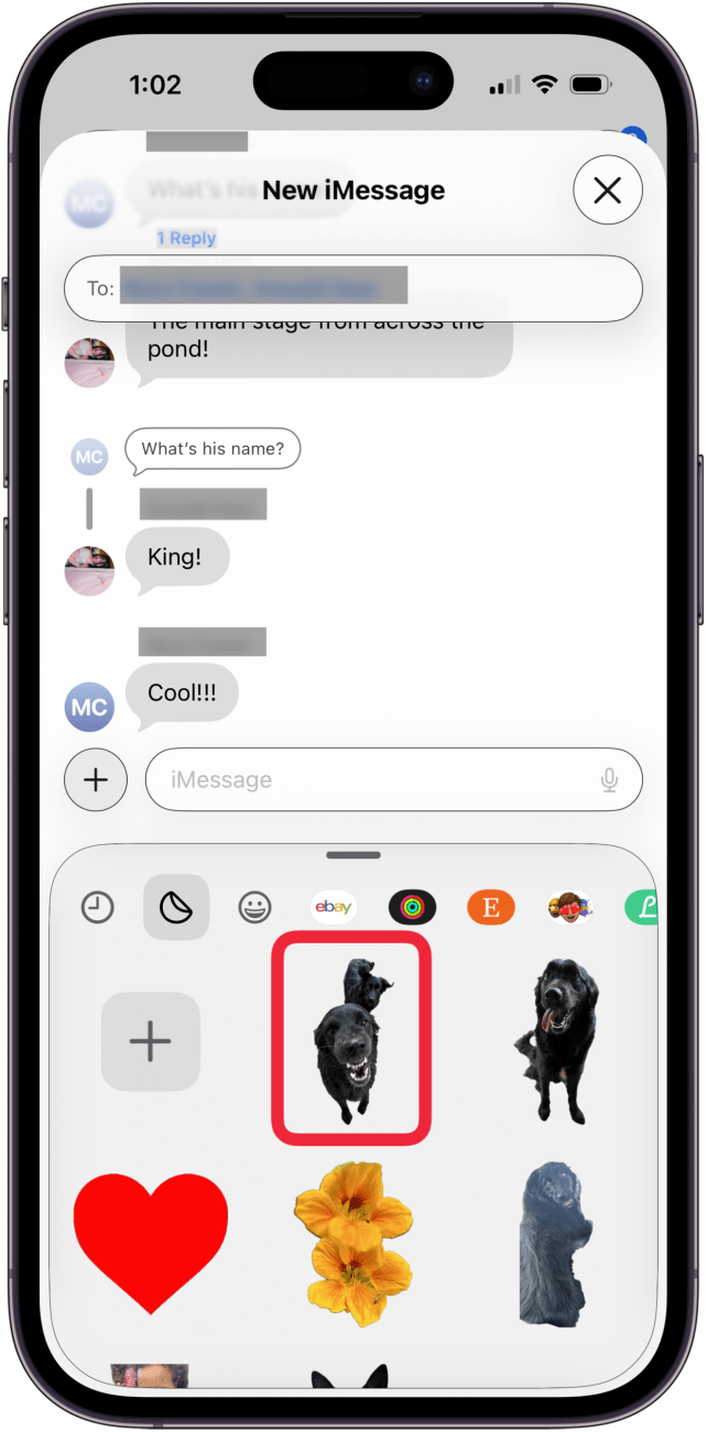 還可以按照上述步驟訪問貼紙,然後從貼紙抽屜中拖動貼紙並將其放置在線程中的任何位置。請記住,這僅適用於 Apple 用戶,Android 用戶不會以同樣的方式看到它;他們只會收到一條通知,說明您已回复貼紙/圖片,並且他們會將其視為常規新消息。