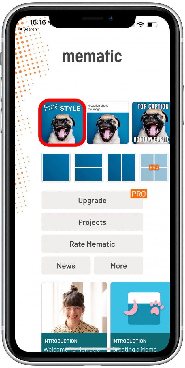 網絡上有無數的表情包生成器,iPhone 應用程序商店中也有幾乎同樣多的表情包製作應用程序。您使用哪個只是一個偏好問題!雖然每個模因製作應用程序的設計都會有所不同,但總體流程應該是相同的。對於這些步驟,我將使用Mematic - 模因製造者(免費)但我會推薦其他人下面是最好的模因生成器應用程序列表。