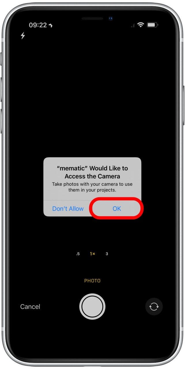 - 當您第一次點擊相機時,您必須允許應用程序打開您的相機。輕敲好的。