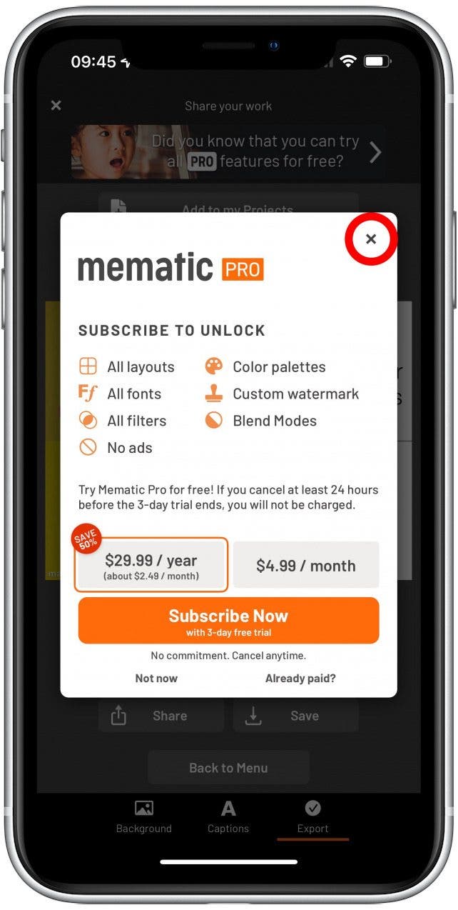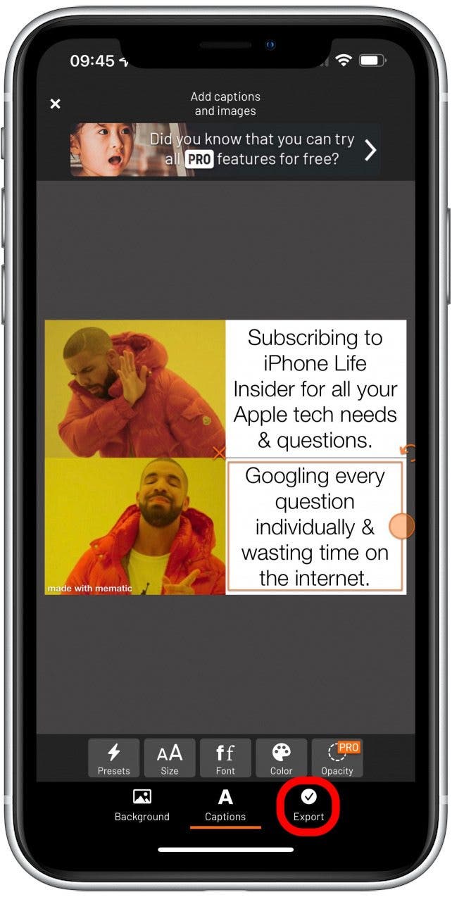 專業提示:我喜歡 Mematic - The Meme Maker,因為它可以用來製作 gif、拼貼畫以及在照片上添加文字,因此它還可以兼作照片編輯器!熟悉所有功能可能需要一些時間,但它非常易於使用,而且免費版本足以滿足您所有模因生成器的需求。