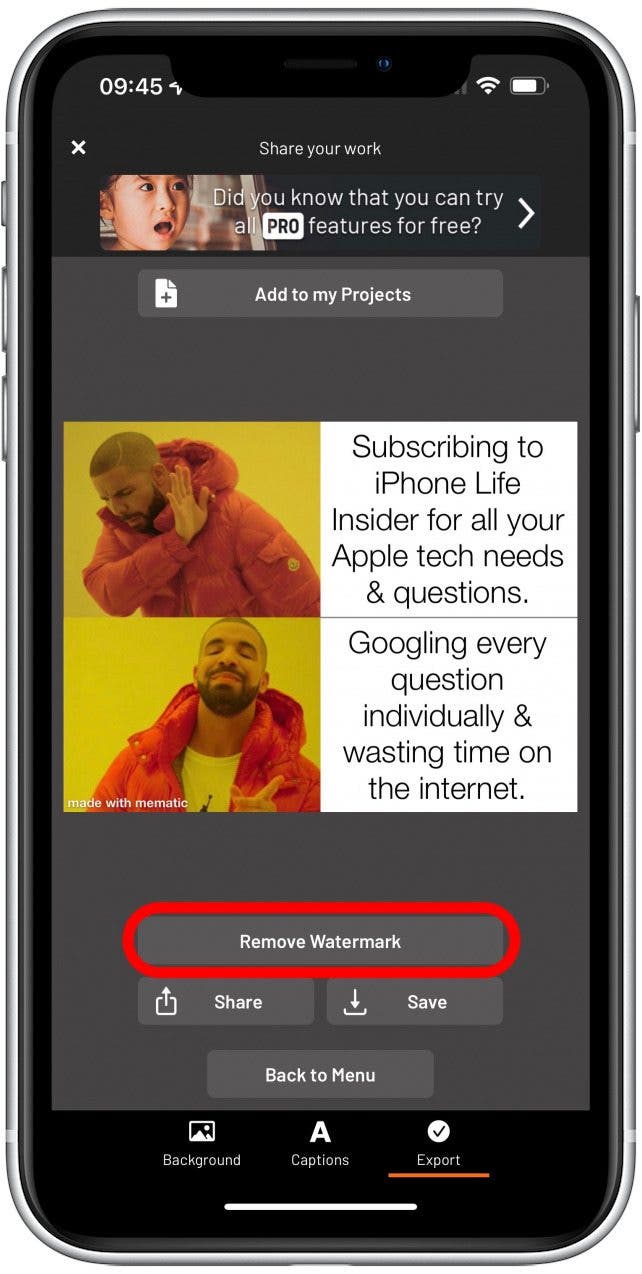 - 在這裡你會看到選項刪除水印,它消除了您可以在圖像上看到的用模因文本製作的小文本。