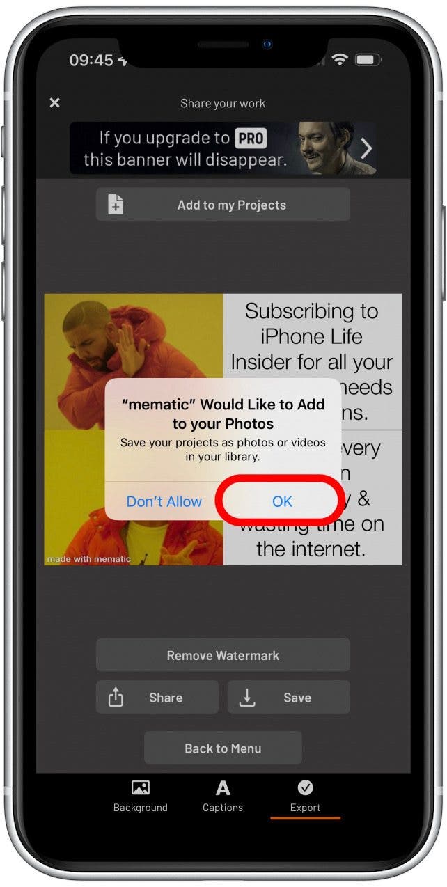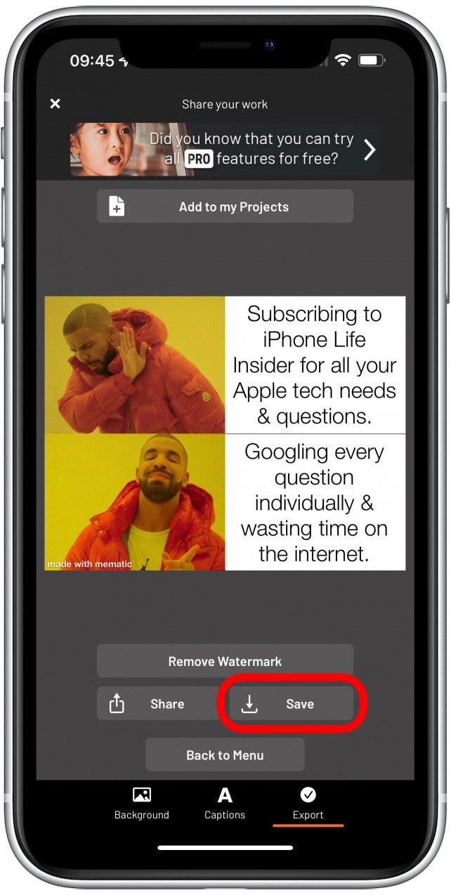 - 要將模因保存到您的照片應用程序,請點擊節省。