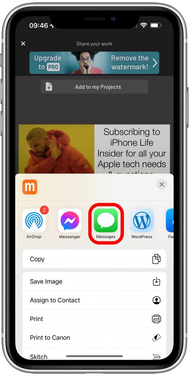 - 您可以在這裡將其發送給朋友和家人,或發佈到網上。例如,要通過文本發送,請點擊留言。