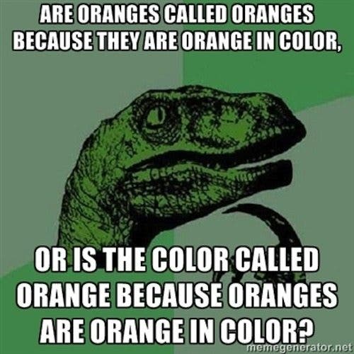 這裡有一個名為“Philosoraptor”的流行模因的例子,它的形像是一隻猛禽抓著下巴,彷彿在深思熟慮,思考著宇宙的存在問題和陰謀。我在下面提供了兩個模因示例,因此您可以看到圖像是相同的,但標題不同但與特定圖像相關。