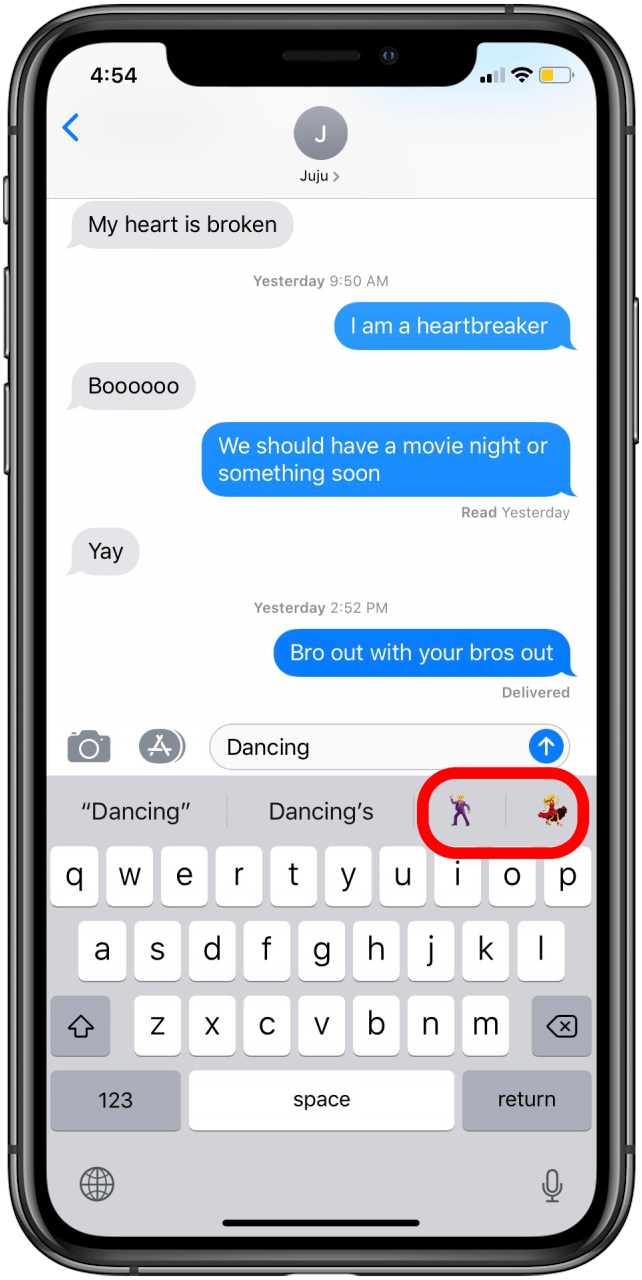 - 在文本框對話線程的,輸入單詞你想用。如果有與之配套的表情符號,它將與其他預測文本一起出現在文本框下方。