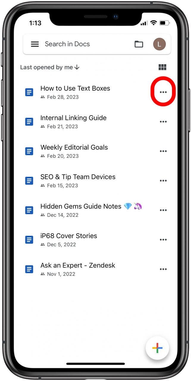 - 找到您要打印的 Google 文檔,然後點擊更多圖標(標題右側的三個點)。