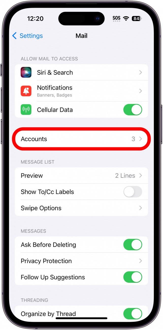 - 打開設置應用程序,向下滾動,然後點擊郵件。