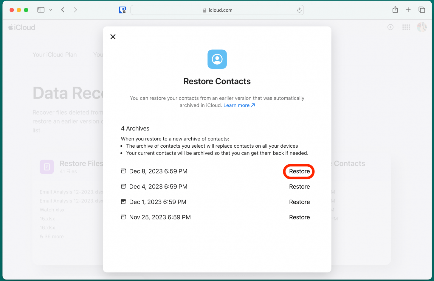 恢復完成後,您將收到一封來自 iCloud 的電子郵件,確認您的聯繫人已恢復到與您的 Apple ID 關聯的所有設備上的“電話和通訊錄”應用中。