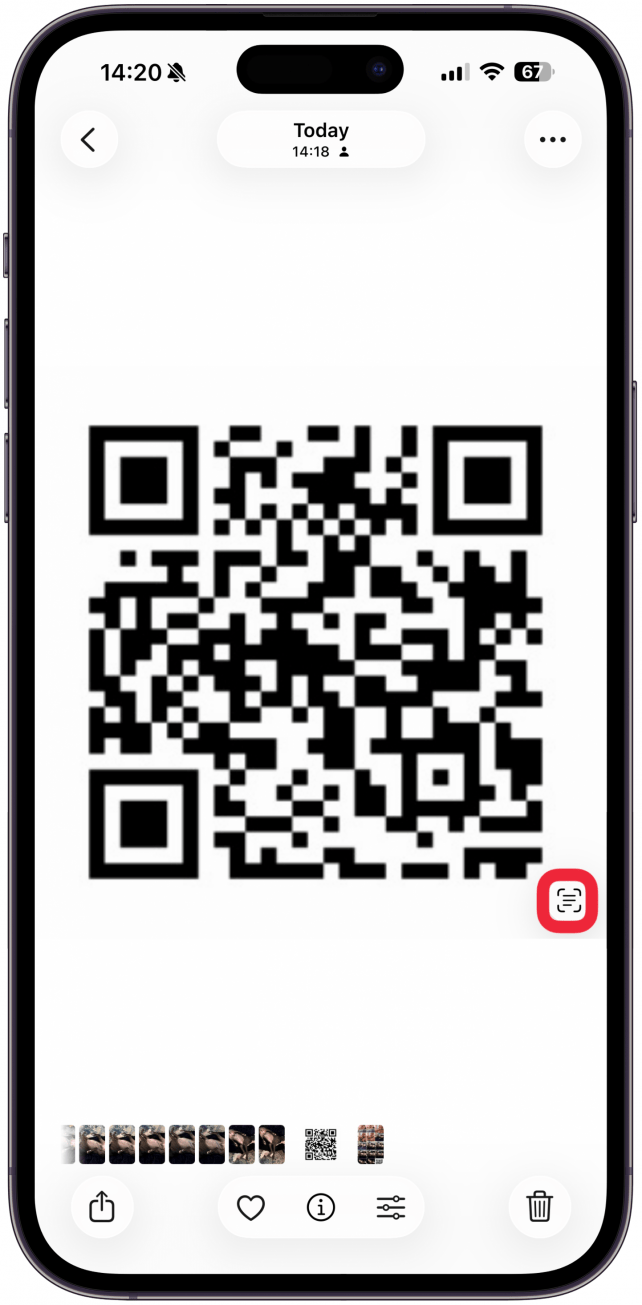 - 按住圖像中的二維碼。有時,您的照片應用程序會自動檢測 QR 碼並在您啟用實時文本之前掃描它。