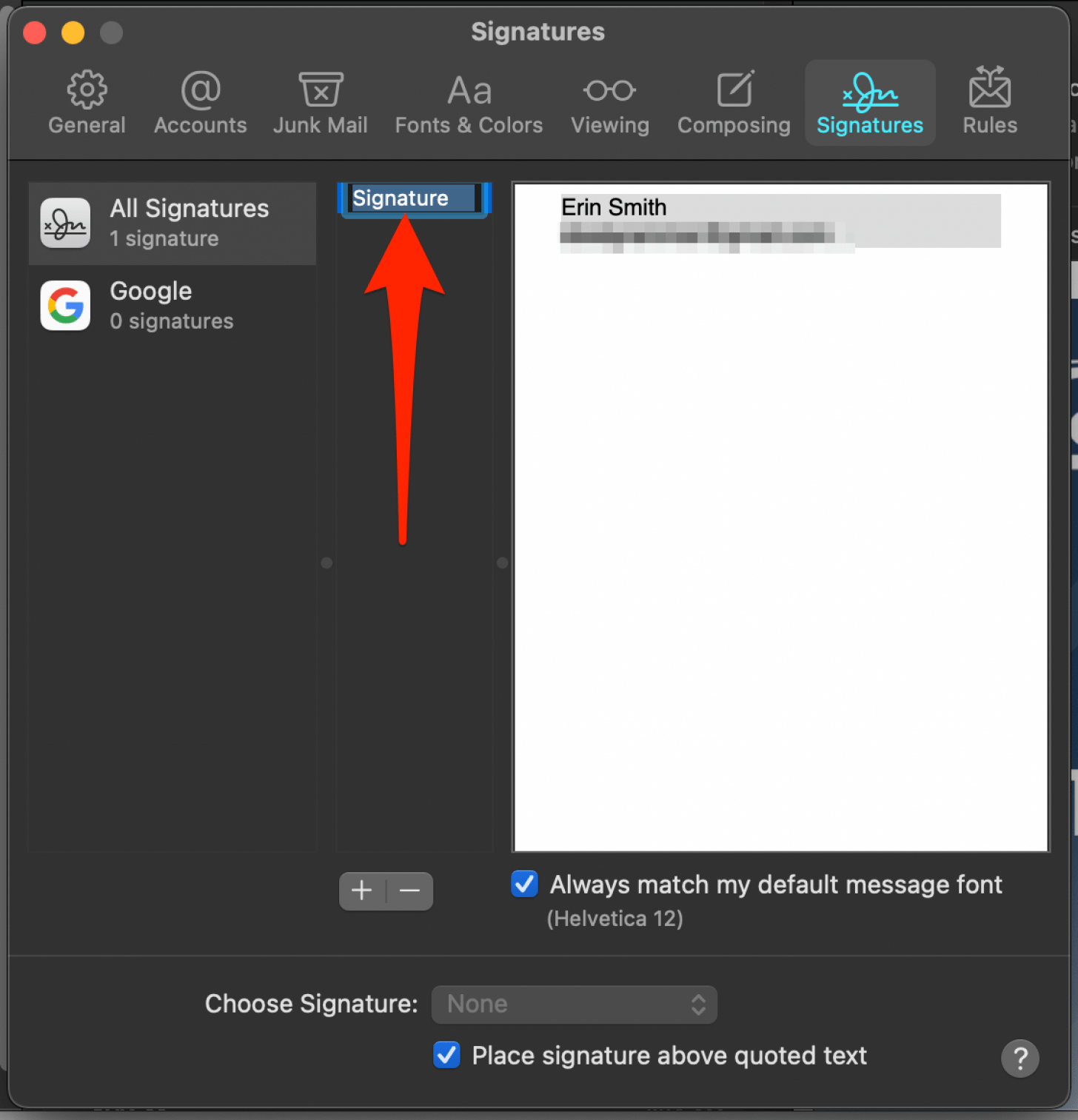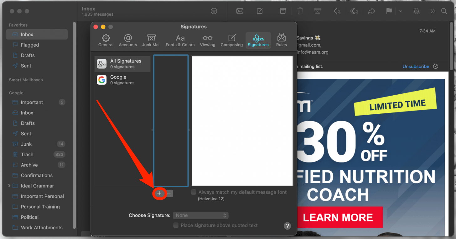 - 選擇您要添加簽名的帳戶,然後單擊+ 按鈕。