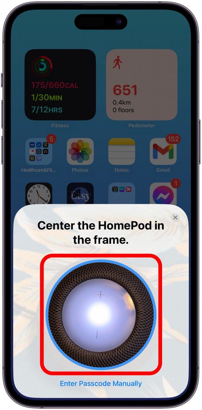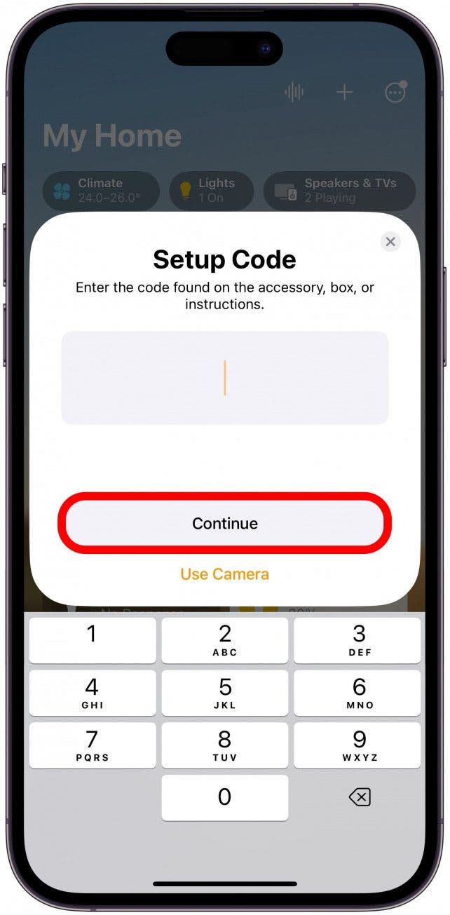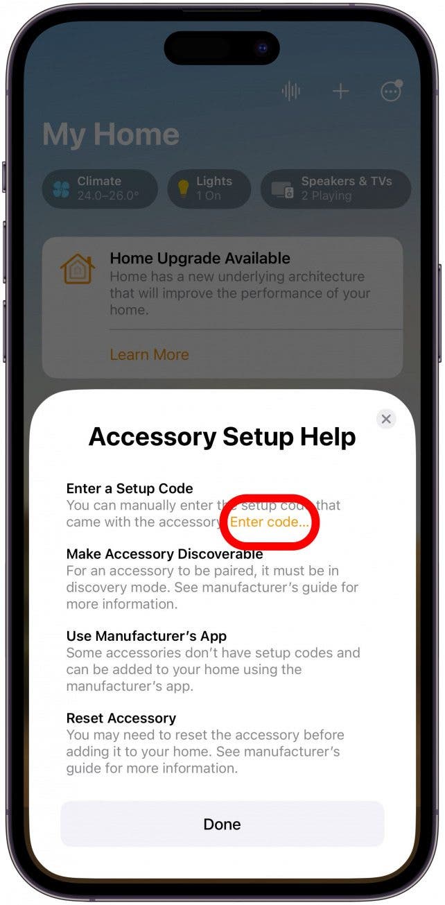 最後,如果這些方法都不起作用,您可以在家庭應用程式中手動輸入代碼。程式碼位於 HomePod 隨附的包裝中。若要輸入可在 HomePod 包裝中找到的八位代碼: