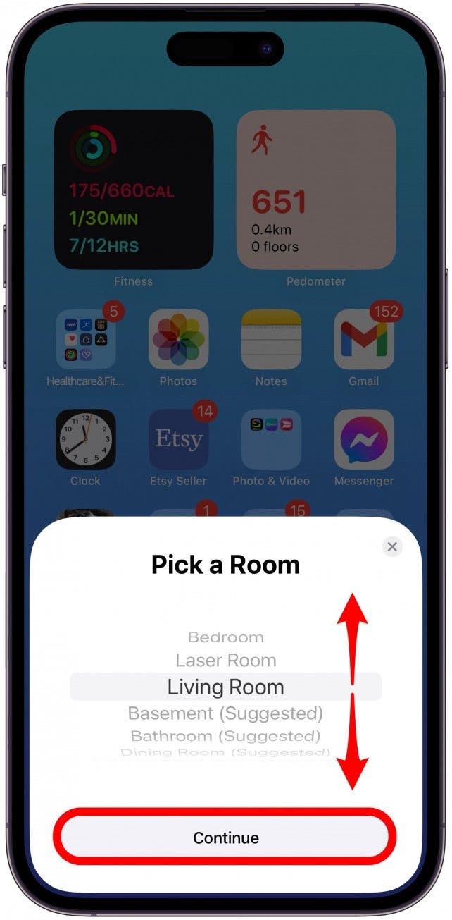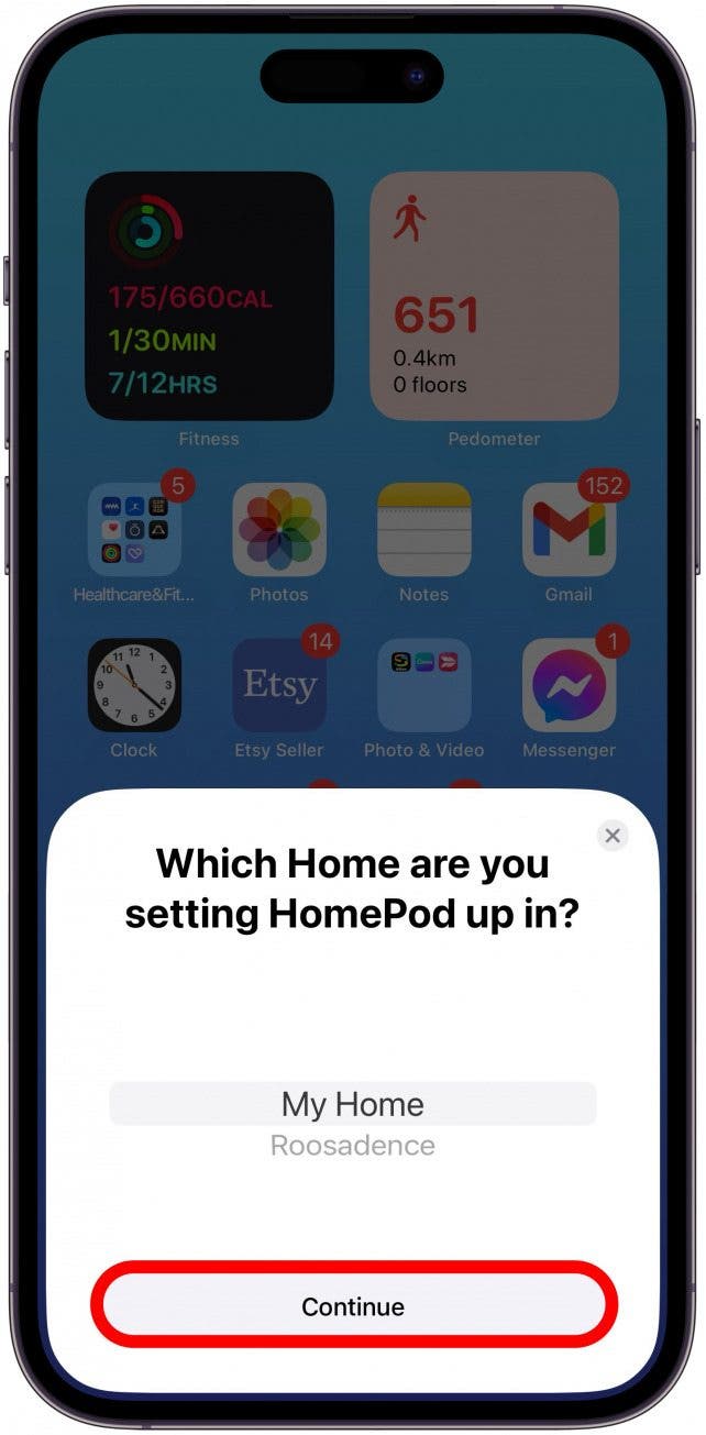 - 選擇您想要新增 HomePod 的家庭。如果您有多個主頁,則可以上下滑動以在它們之間導航。輕敲繼續。