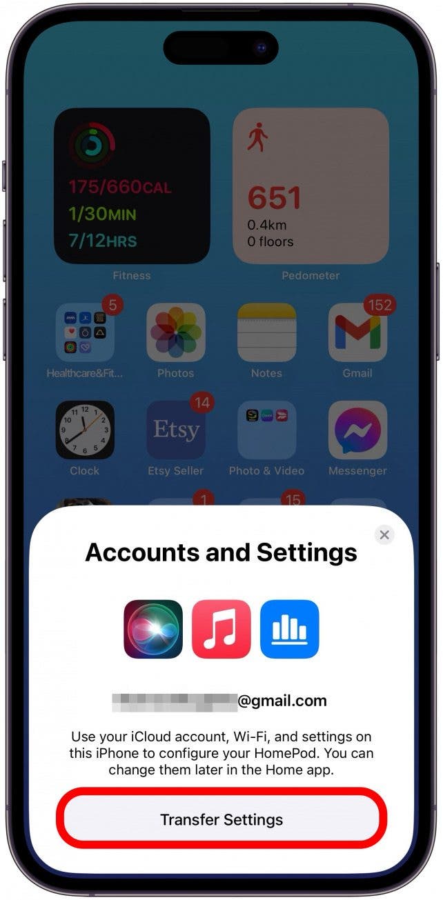 - 您將可以選擇使用 iCloud 帳戶將設定傳輸到 HomePod。輕敲傳輸設定。如果您是第一次執行此操作,您可能會在螢幕上看到不同的指示。