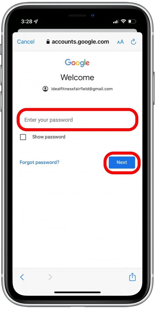 - 輸入您的 Google 帳戶密碼,然後點擊下一個。
