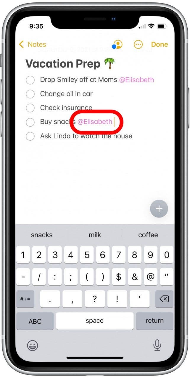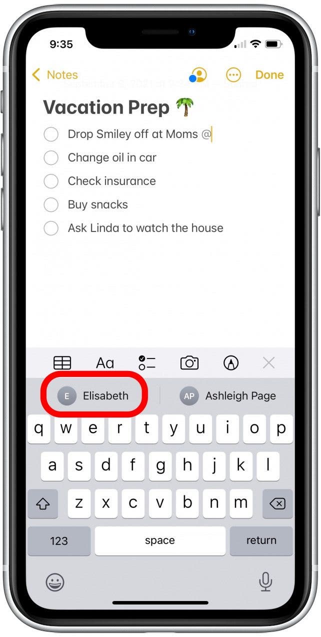 - 共享筆記的人員姓名將顯示在鍵盤頂部。點擊您想要標記的人的姓名。