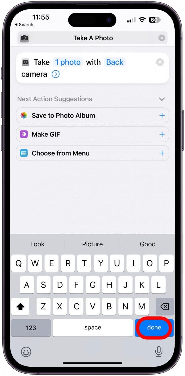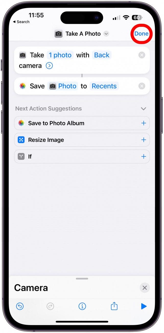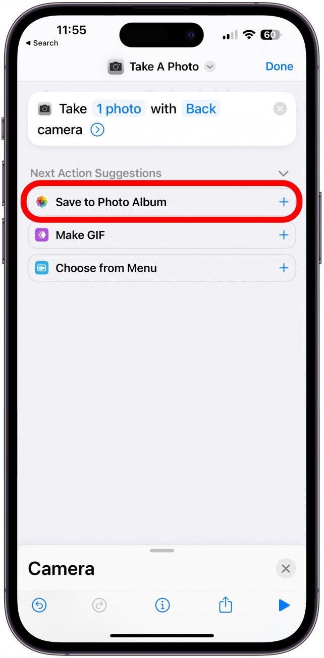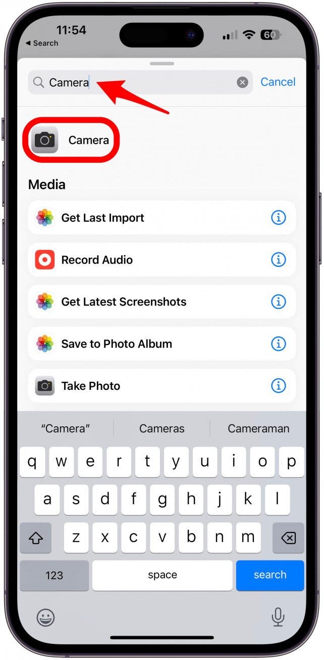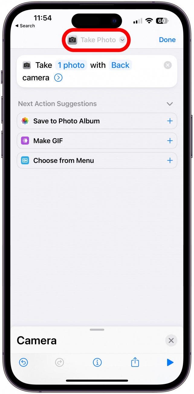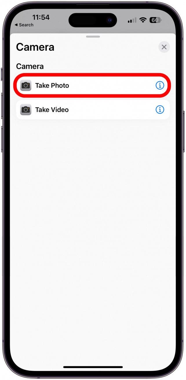 - 選擇拍照,您可以使用“拍攝視頻”操作創建其他快捷方式。