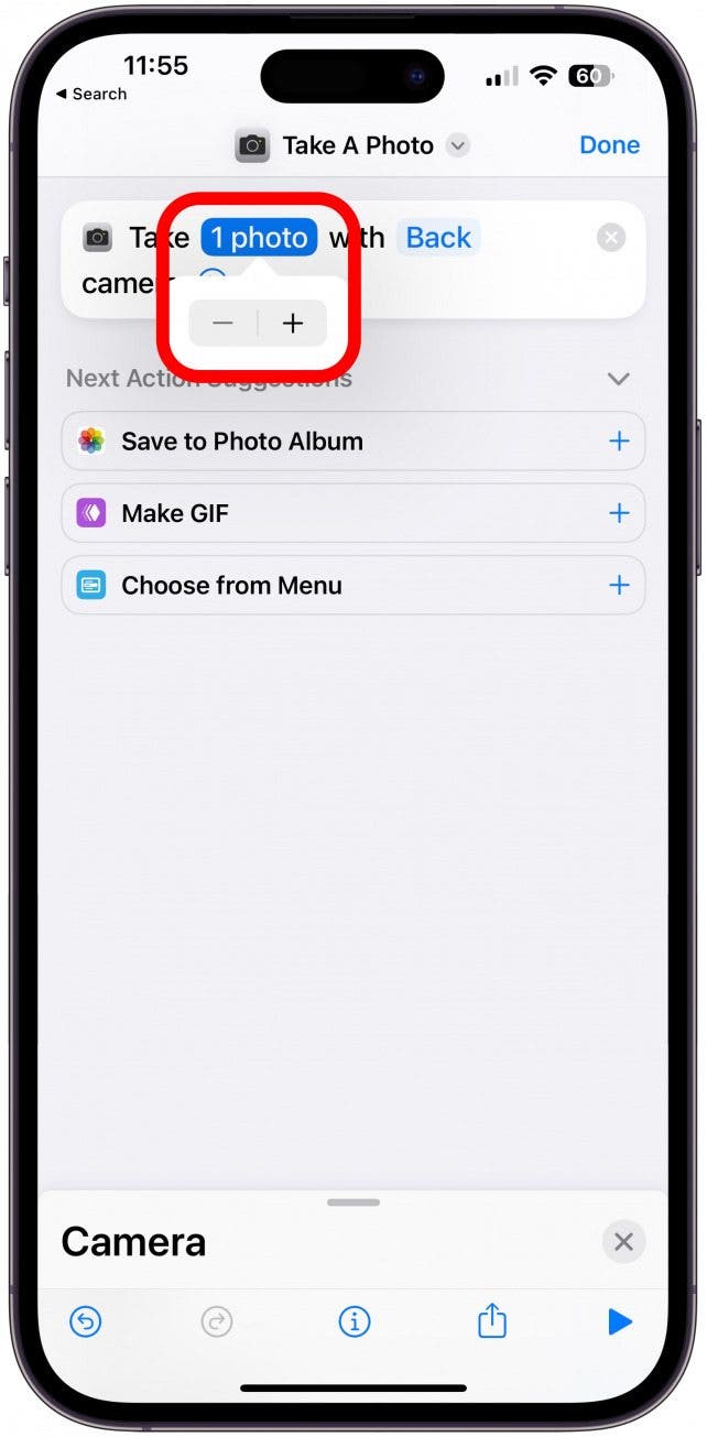 - 輕敲1 張照片如果您想更改此快捷方式以通過點擊加號或減號按鈕拍攝不同數量的照片。