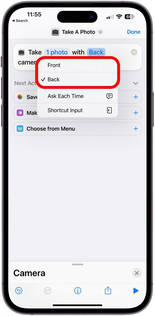 - 如果您點擊後退如果您想使用此命令進行自拍照,可以將其更改為正面。