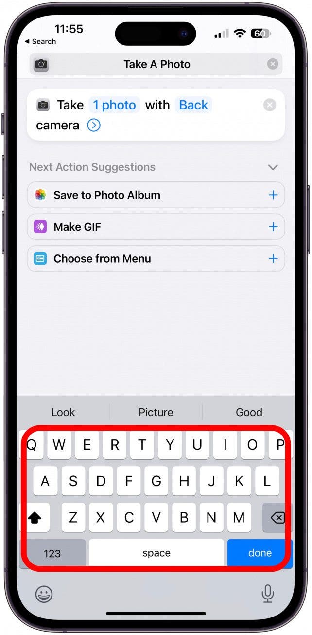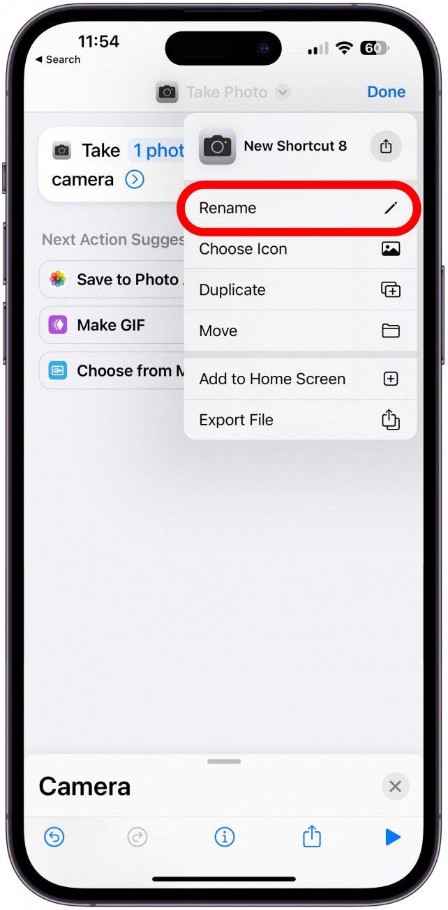 - 以您容易記住的方式命名快捷方式,例如“拍張照片。”
