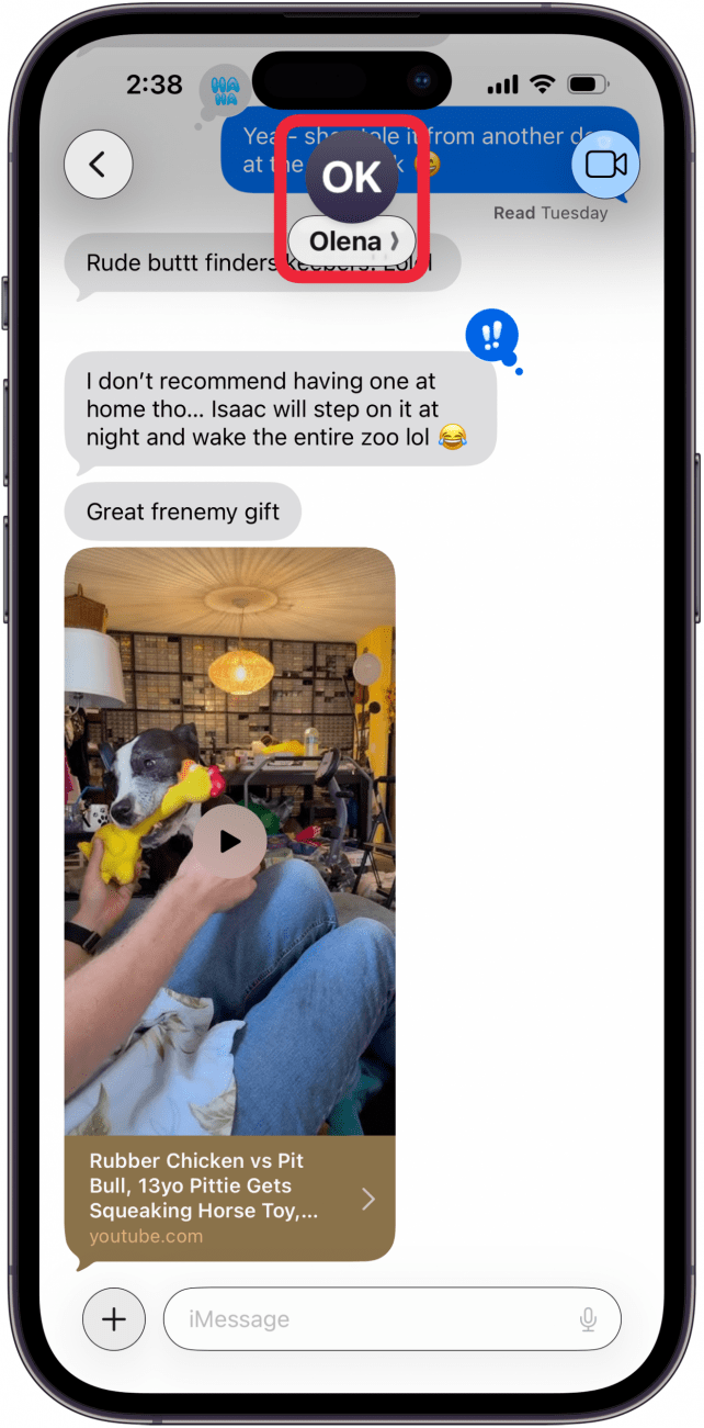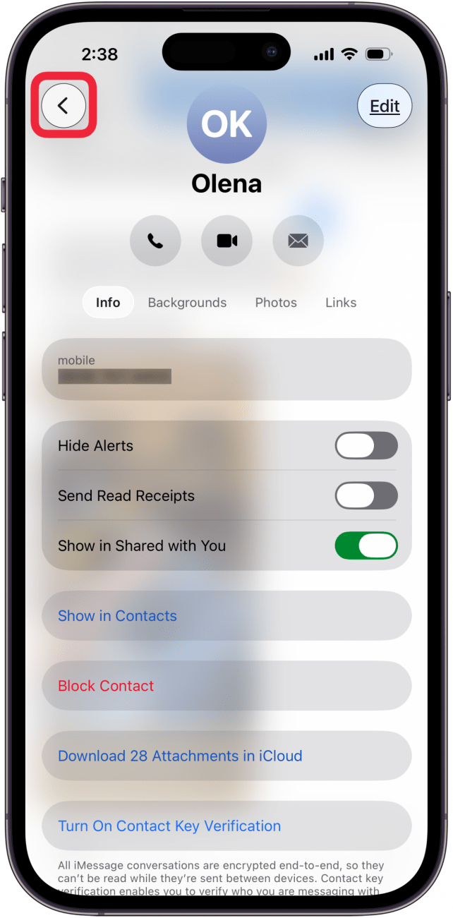 - 輕敲 與您想要打開或關閉已讀回執的聯繫人的文本對話。