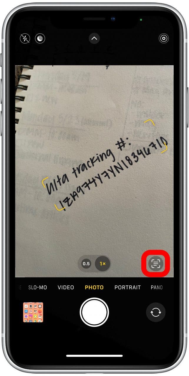 - 將取景器對準包裹追踪號碼的圖像,然後點擊“實時文本”按鈕。