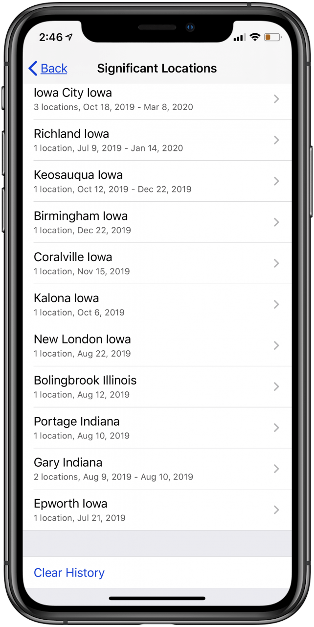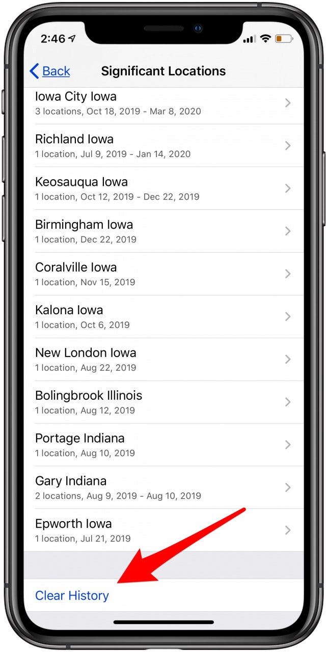 - 要清除您的 iPhone 位置歷史記錄,請滾動到“重要位置”列表的底部,然後點按清除歷史記錄。
