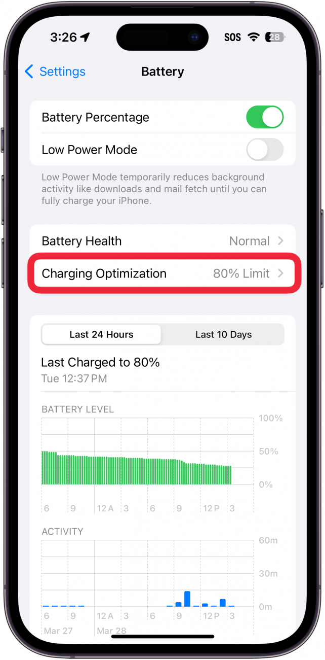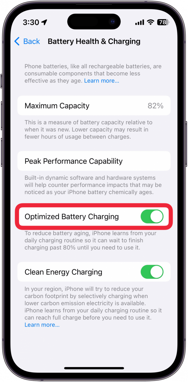 - 如果您使用的是 iPhone 15 或更高版本,這裡有兩個選項。如果您使用的是 iPhone 14 或更舊版本,請跳至步驟 4。否則,請點按充電優化。