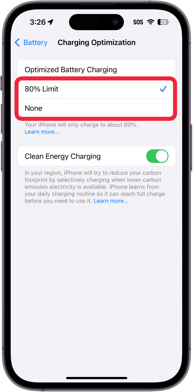 - 選擇其中之一80% 限制或者沒有任何。80% 限制將使您的 iPhone 只充電到 80% 並停止。這有助於保護電池。如果您希望 iPhone 始終無延遲地充電 100%,請選擇沒有任何。