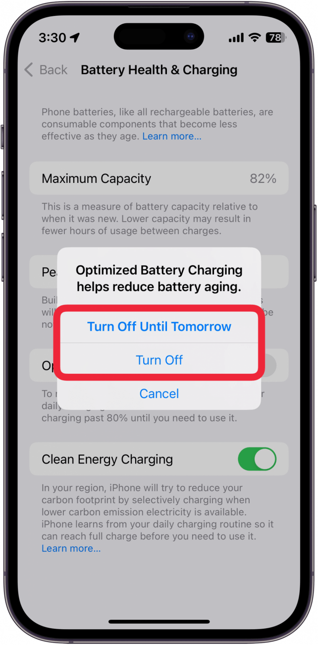 - 選擇關閉直到明天或者關,無論您喜歡哪個。關閉將使充電優化保持關閉狀態,直到您再次將其重新打開。