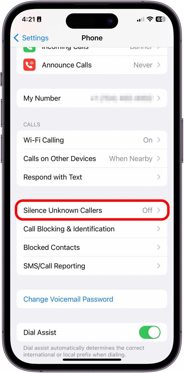 - 切換讓未知來電者保持沉默關閉。禁用時它將呈灰色。
